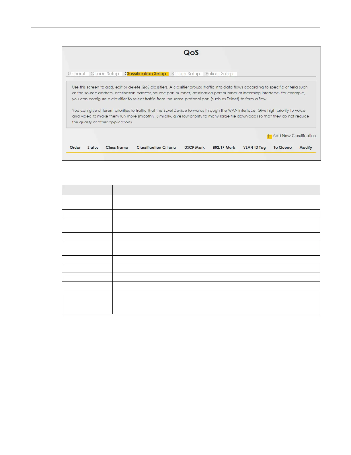 Table 90 Network Setting > QoS > Classification Setup