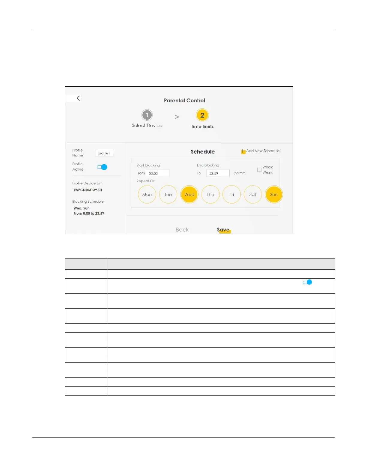 Repeat On Select the days when Internet access is blocked on the profile devices. Select Whole Week and