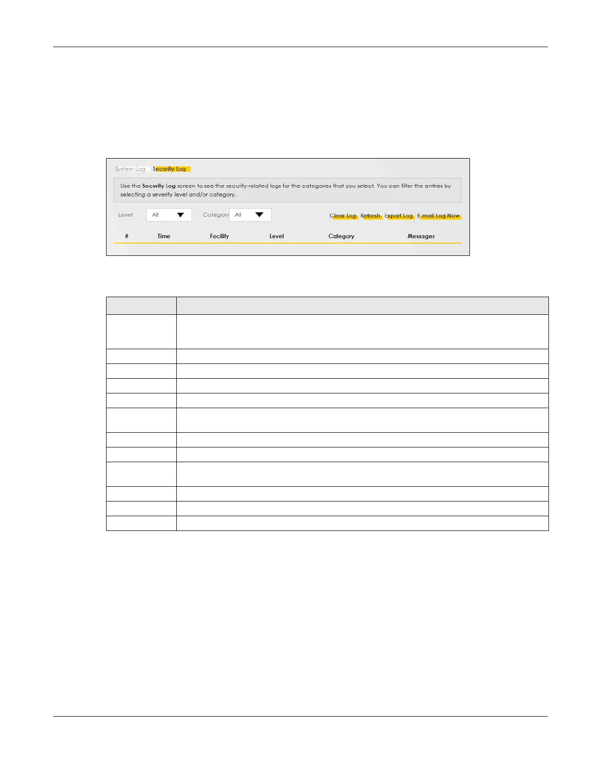 Use the Security Log screen to see the security-related logs for the categories that you select. You can