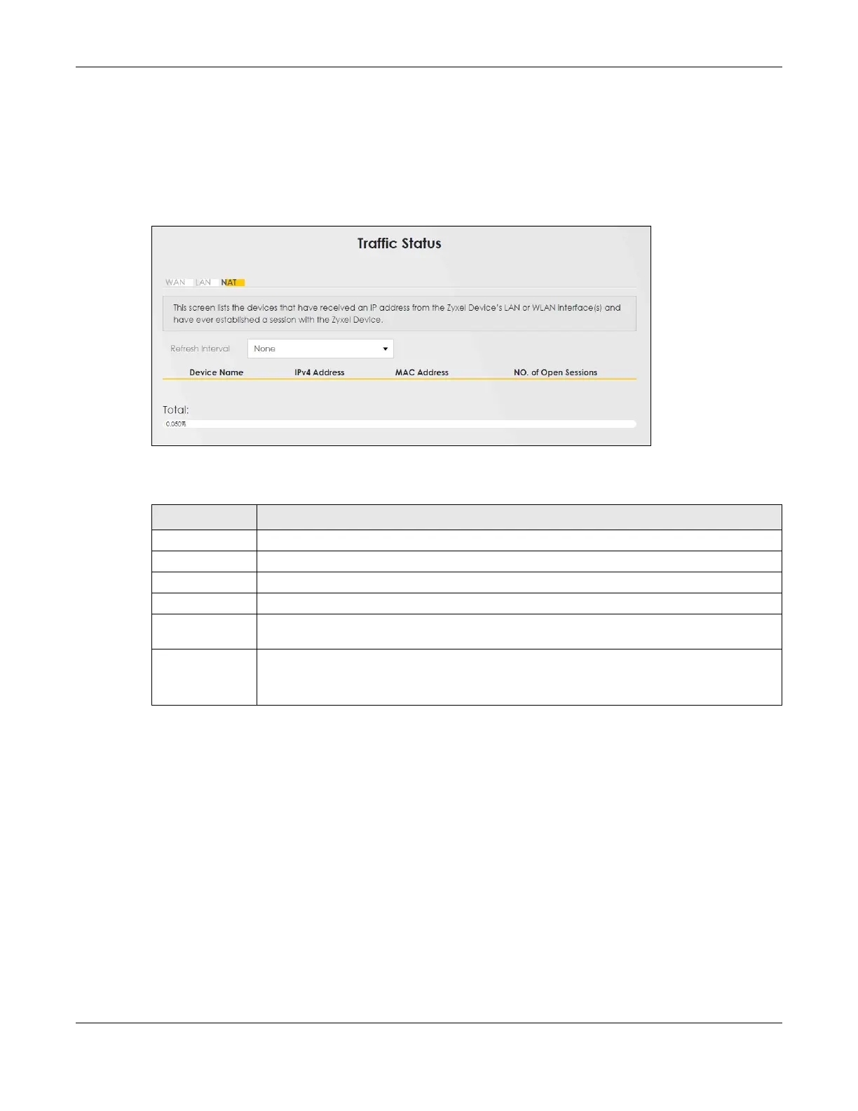Click System Monitor > Traffic Status > NAT to open the following screen. This screen lists the devices that