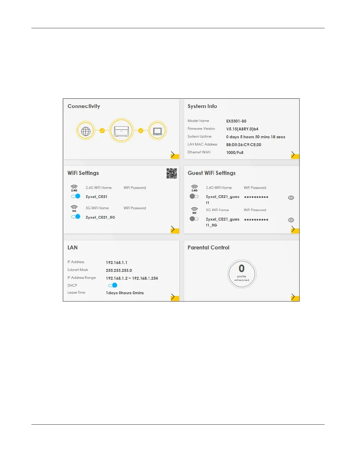 6 The Connection Status screen appears. Use this screen to configure basic Internet access and WiFi