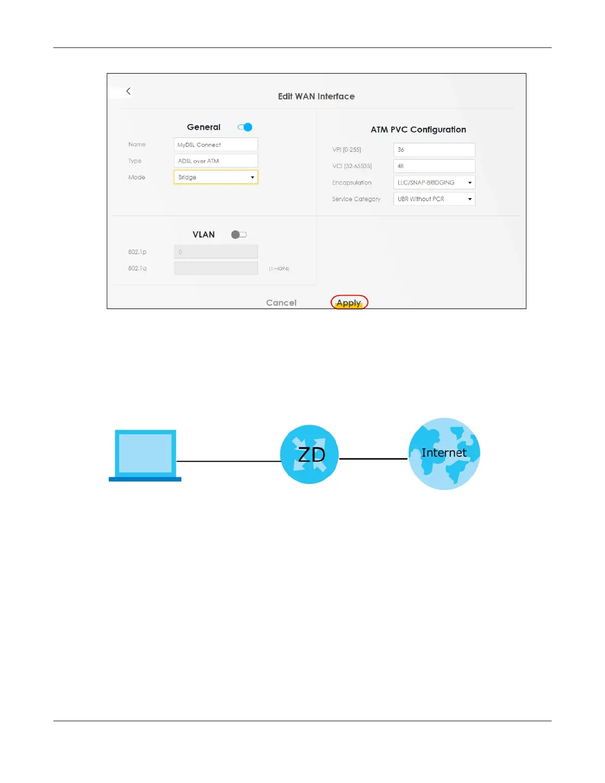 modem or router with Internet access to the WAN Ethernet port on the Zyxel Device. You need to