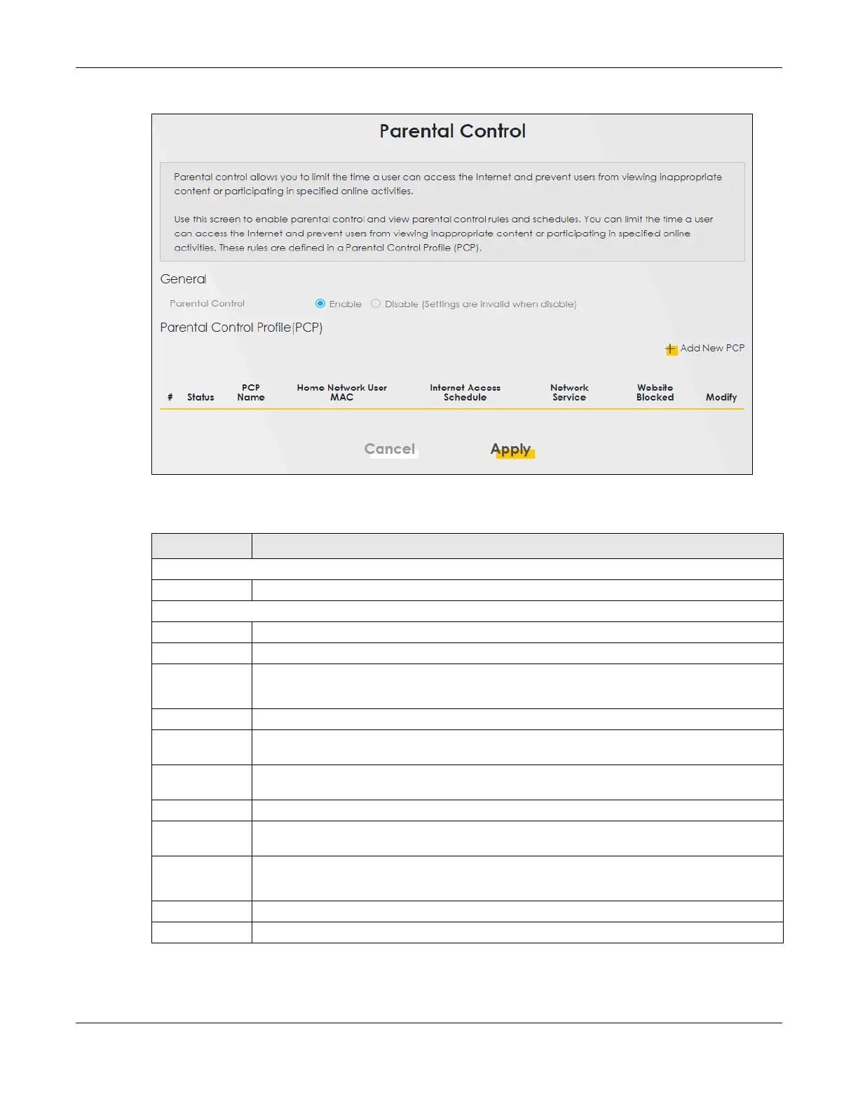 Add new PCP Click this if you want to configure a new Parental Control Profile (PCP).