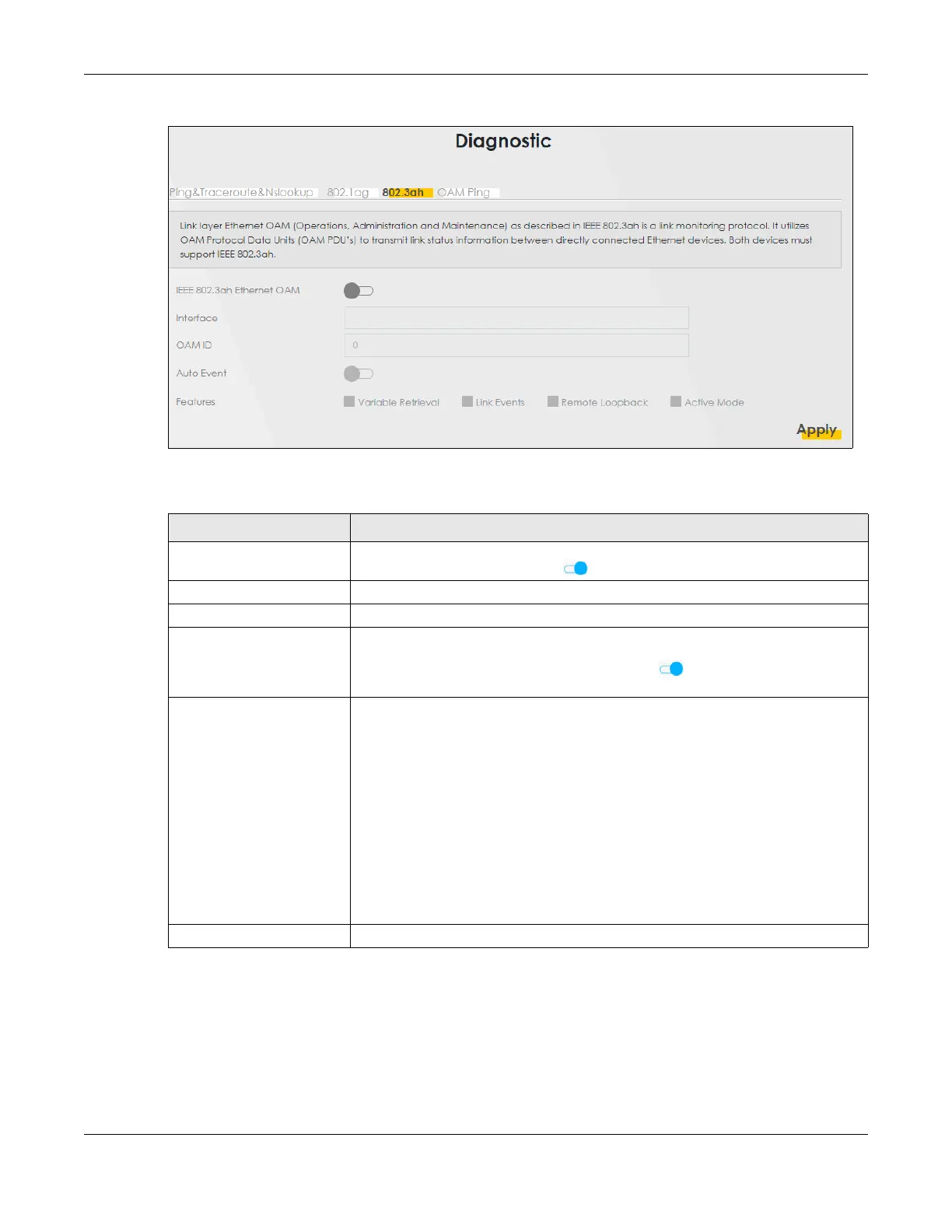 IEEE 802.3ah Ethernet OAM Click this switch to enable or disable the Ethernet OAM on the specified interface.