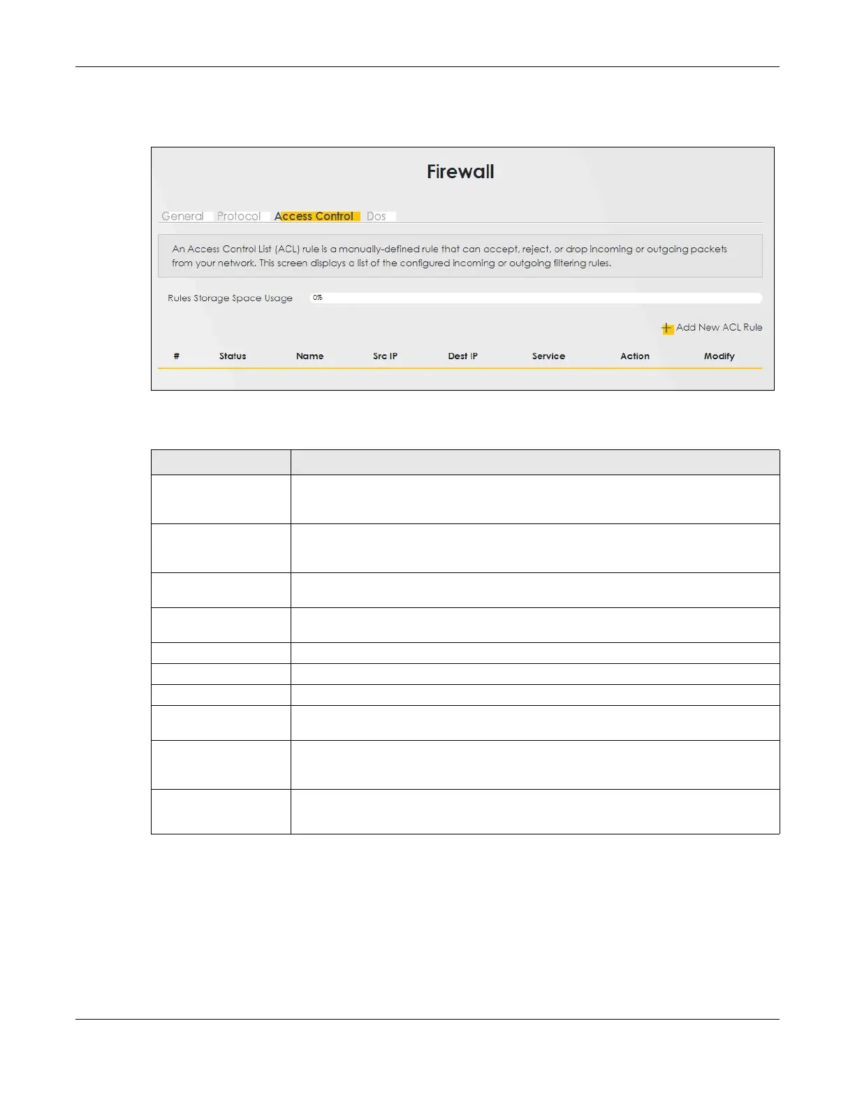 Add New ACL Rule Select an index number and click Add New ACL Rule to add a new firewall rule after the