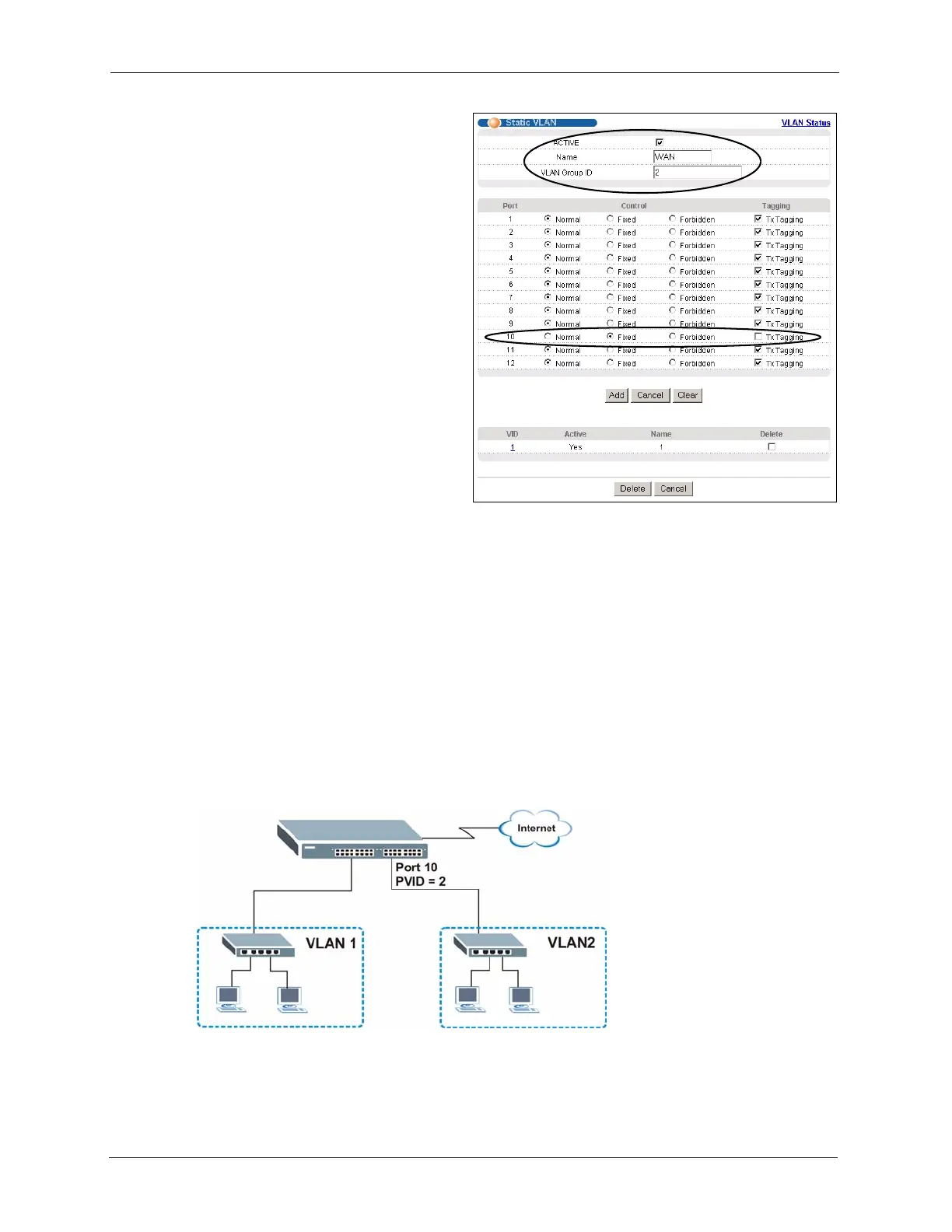 In the example network, configure 2 as the port VID on port 10 so that any untagged frames