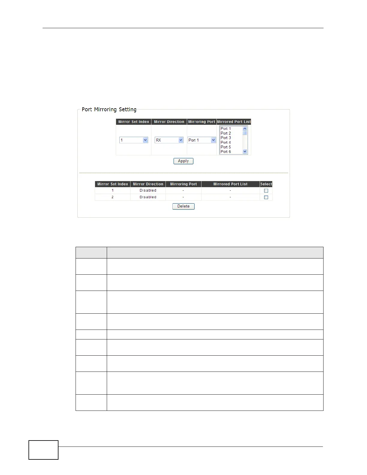 Table 26 Configuration > Mirroring > Port-based Mirroring