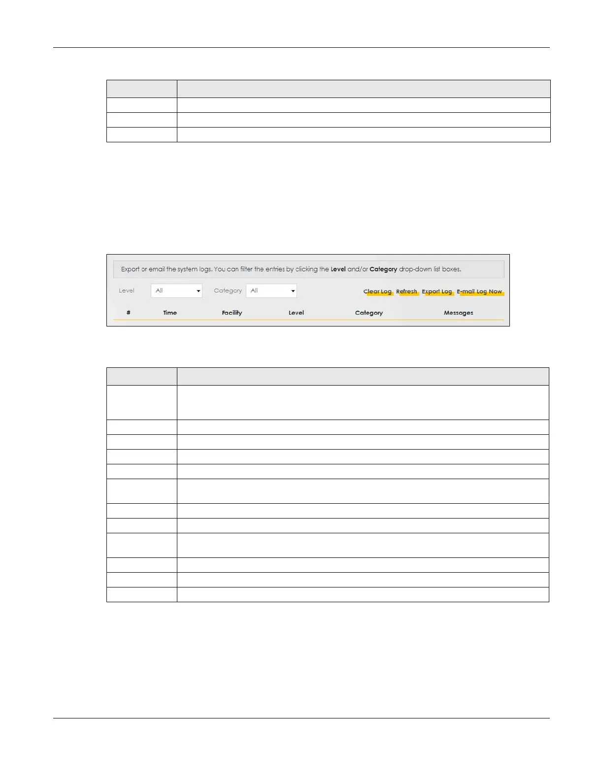 Level This field displays the severity level of the log that the device is to send to this syslog server.