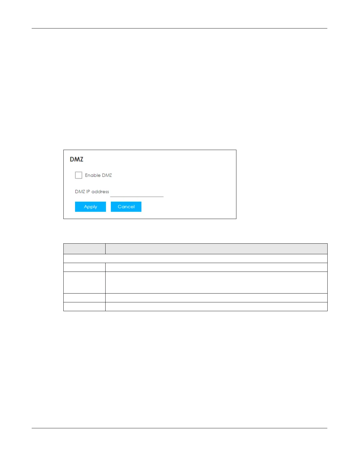 DMZ IP address Type the IP address of your LTE3202-M430’s DMZ port in dotted decimal notation.