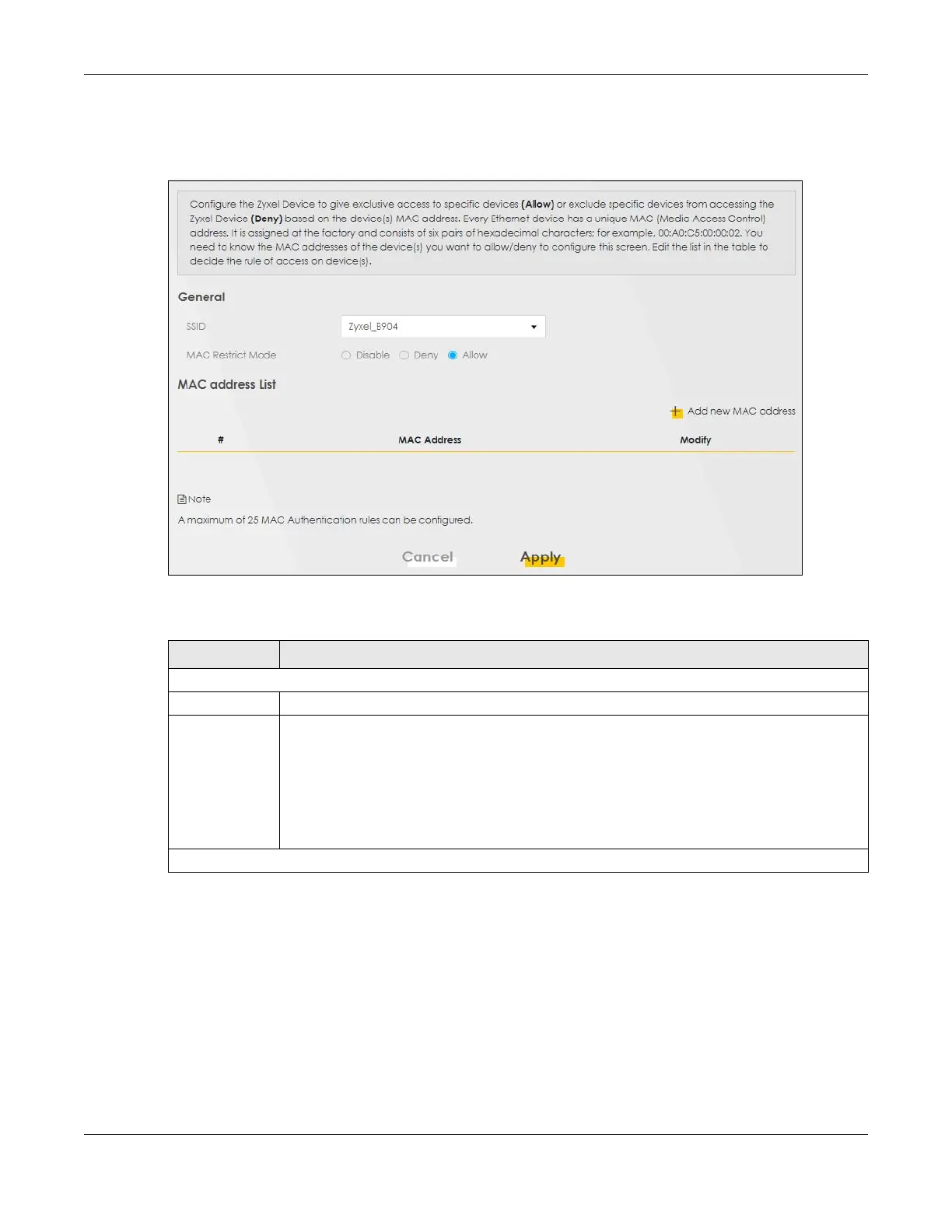 Select Allow to permit access to the Zyxel Device. MAC addresses not listed will be denied