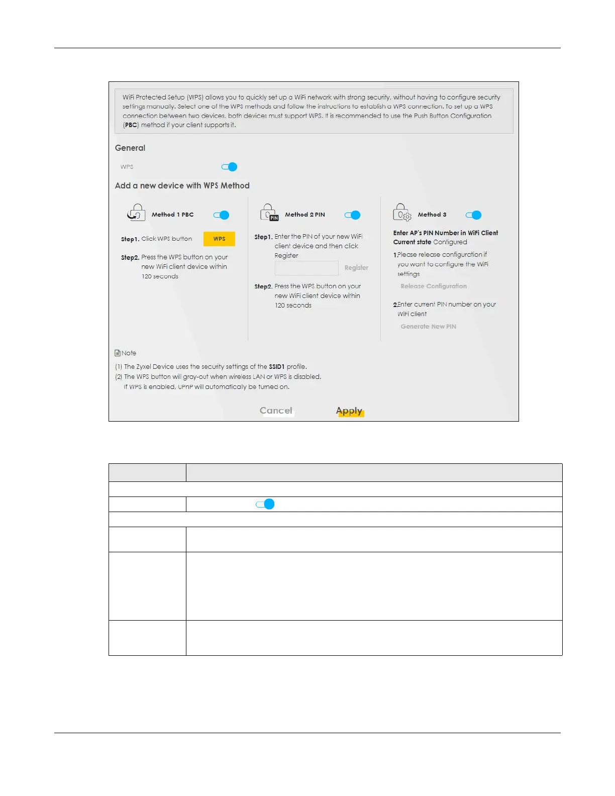 switch to make it turn blue. Click Apply to activate WPS method 1 on the Zyxel Device.