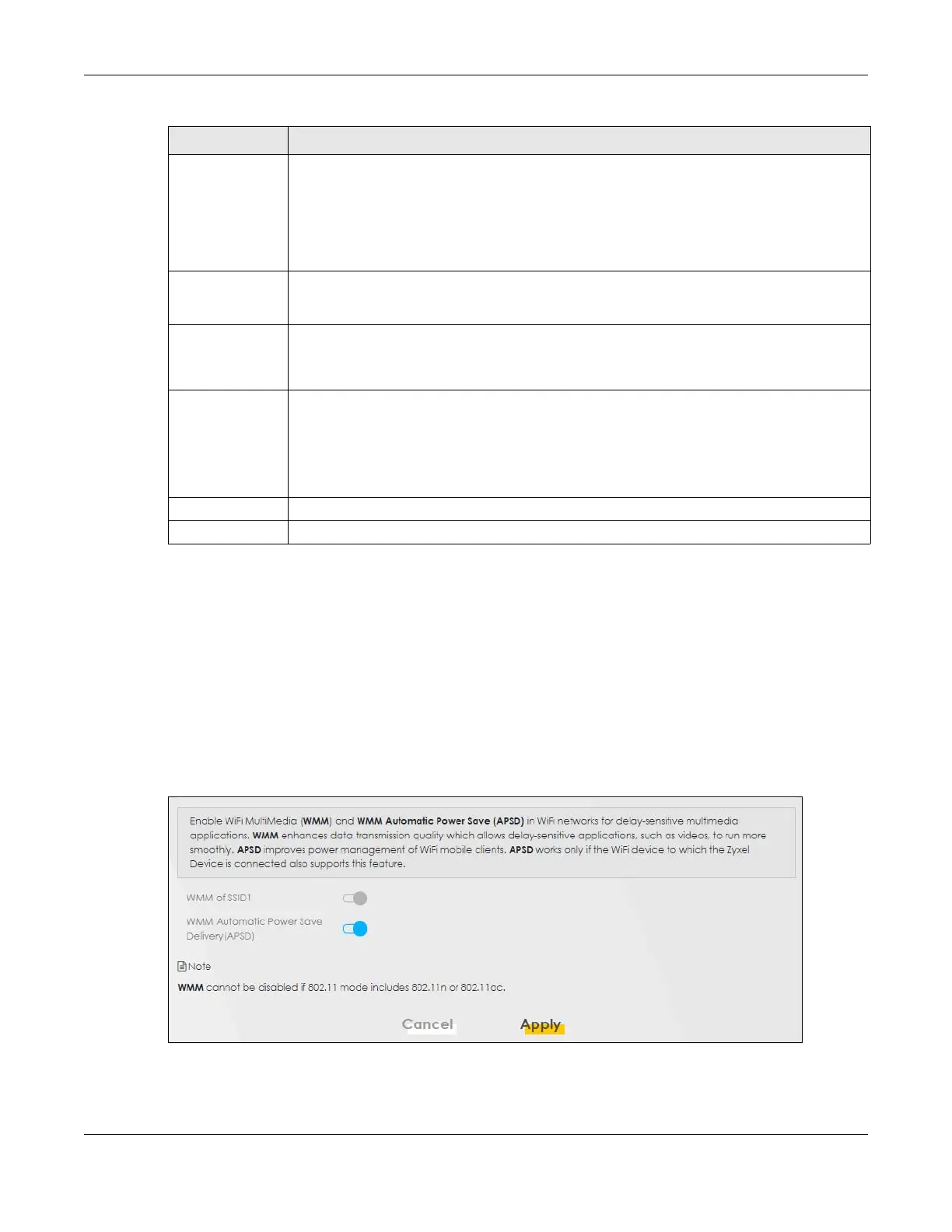 Note: WMM cannot be disabled if 802.11 mode includes 802.11n or 802.11ac.