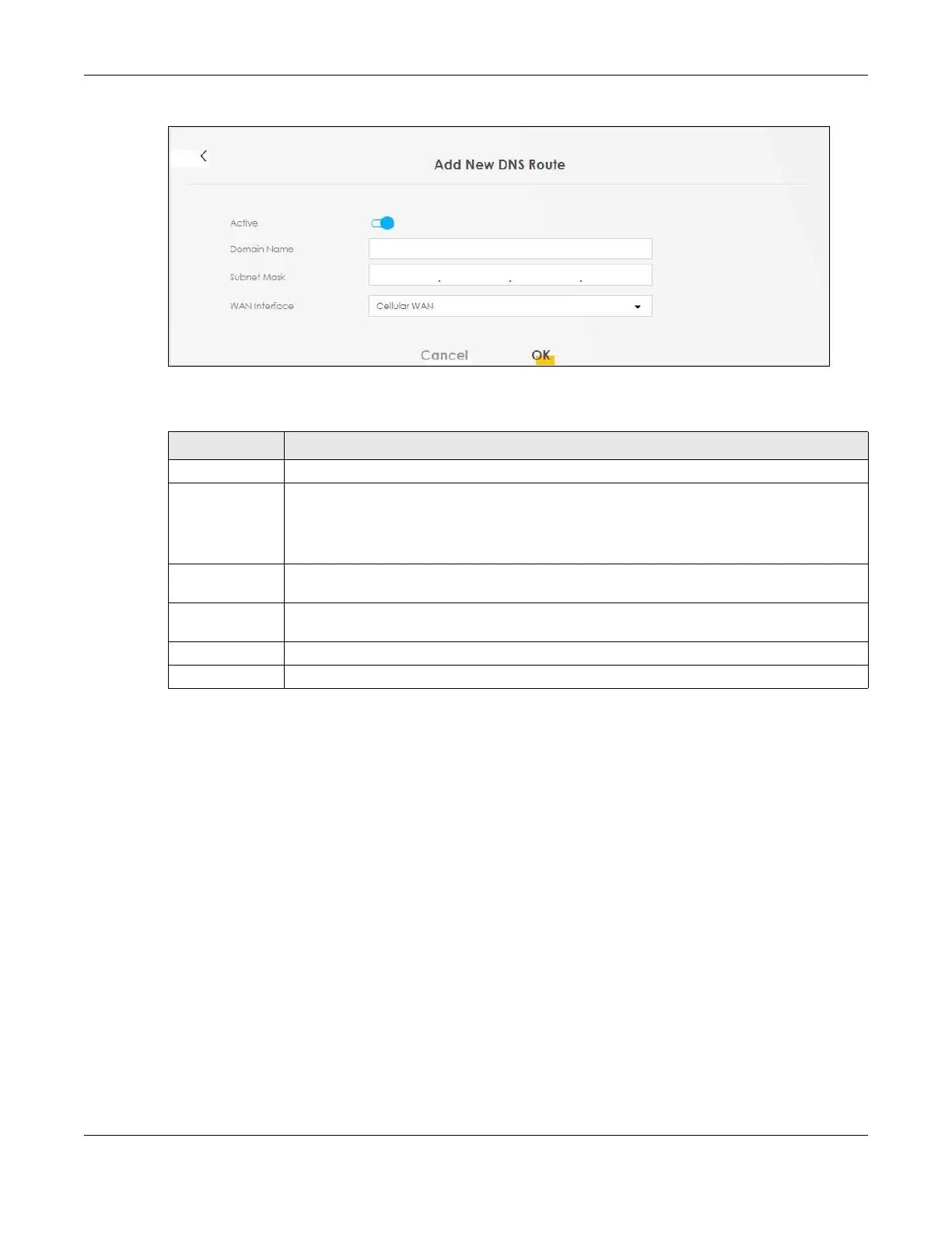 Table 48 Network Setting > Routing > DNS Route > Add New DNS Route