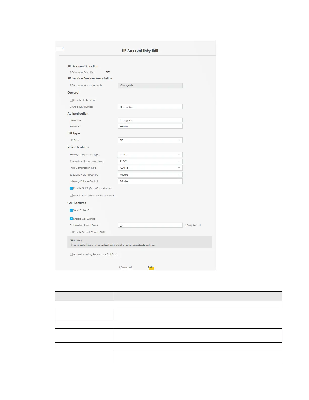Table 84 Voice > SIP > SIP Account > SIP Account Entry Edit