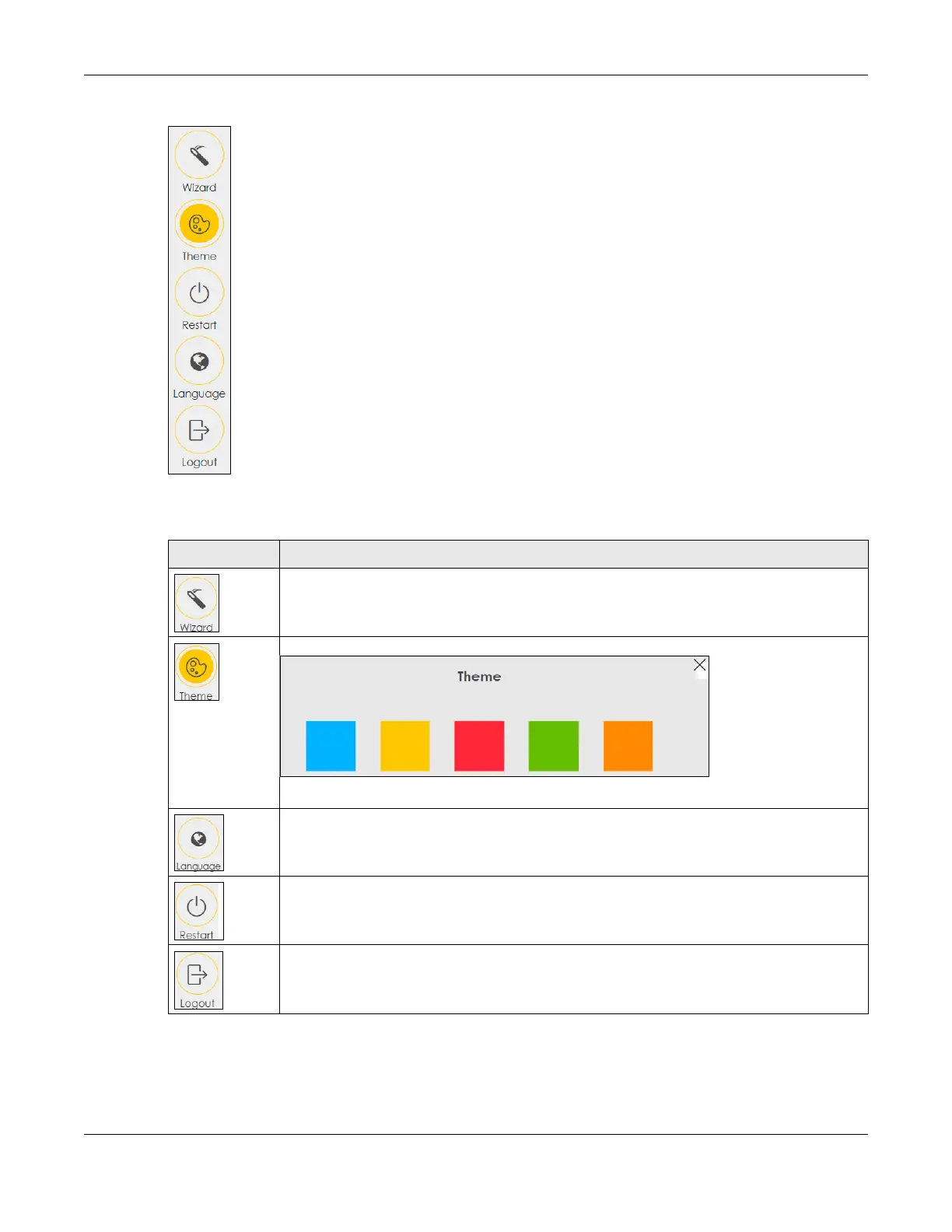 Theme: Click this icon to select a color that you prefer and apply it to the Web Configurator.