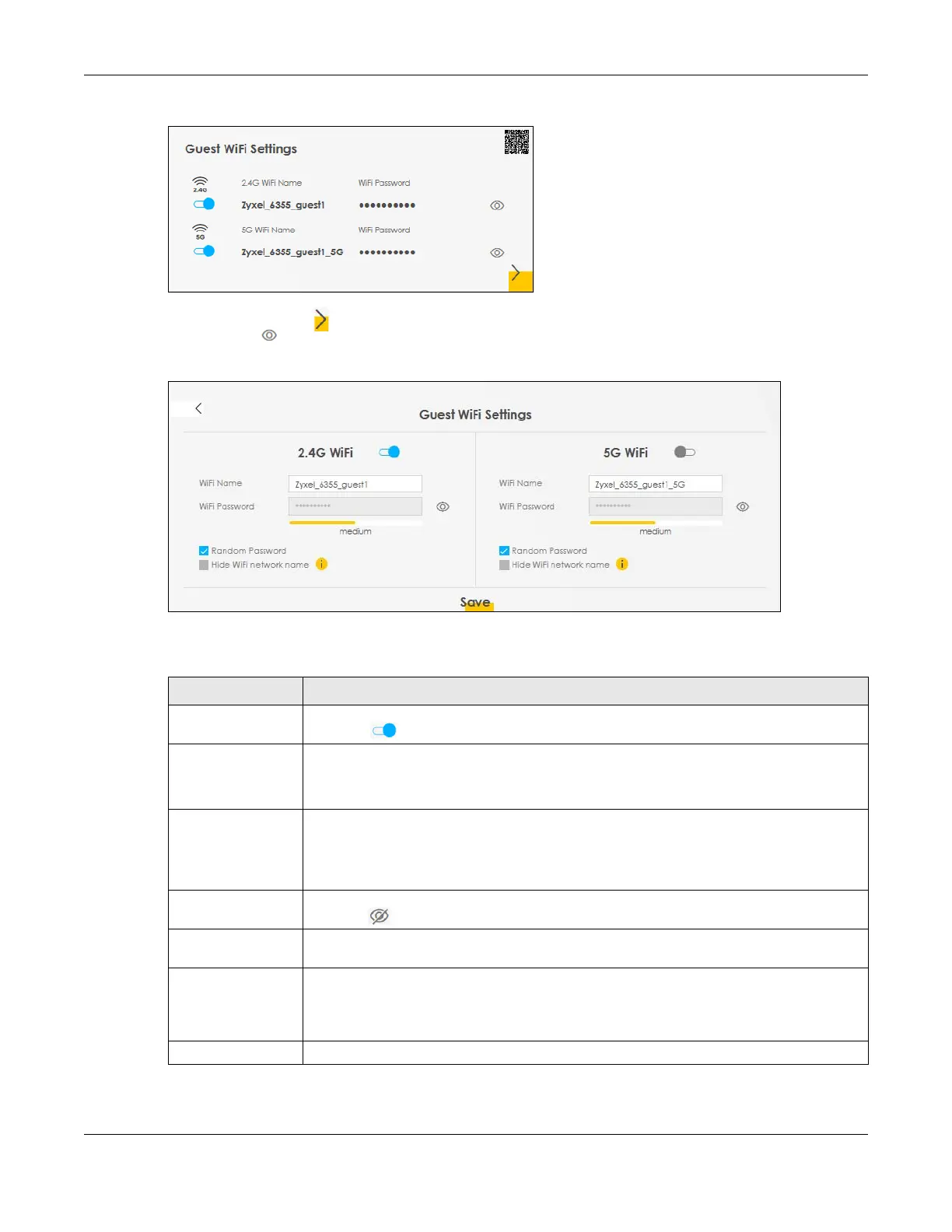 Click the Arrow icon ( ) to configure the SSIDs and/or passwords for the guest wireless networks. Click