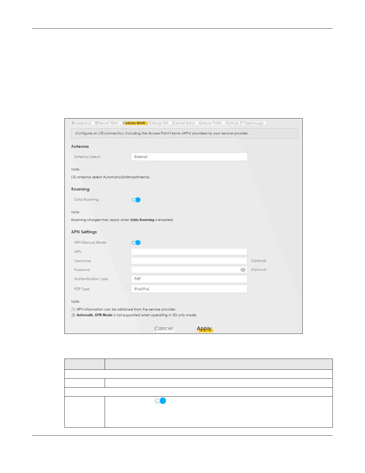 Table 22 Network Setting > Broadband > Cellular WAN