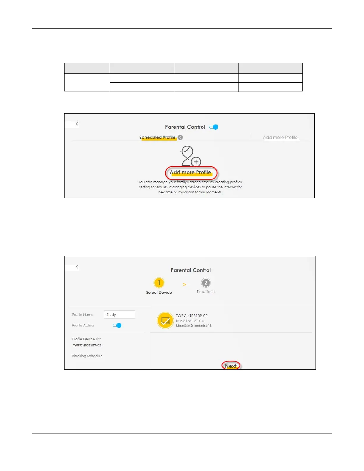 1 Click Add more Profile to open the Parental Control screen.