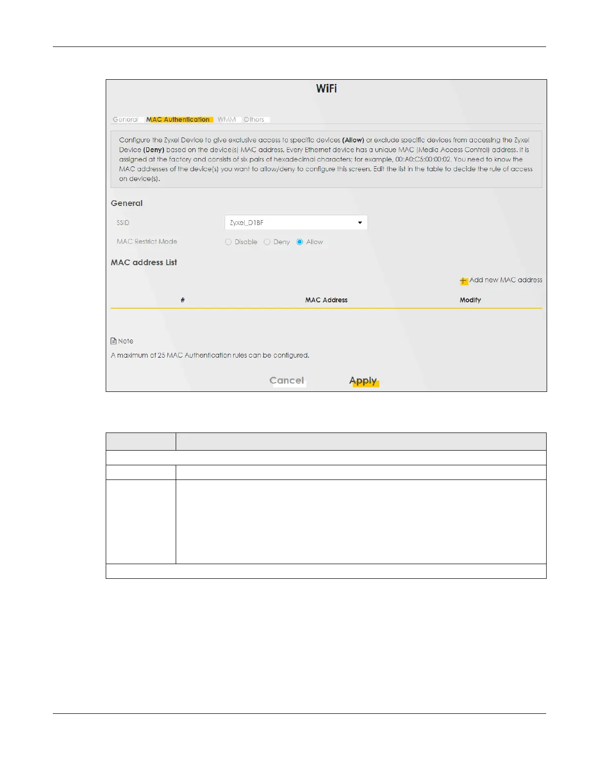 Select Deny to block access to the Zyxel Device. MAC addresses not listed will be allowed to