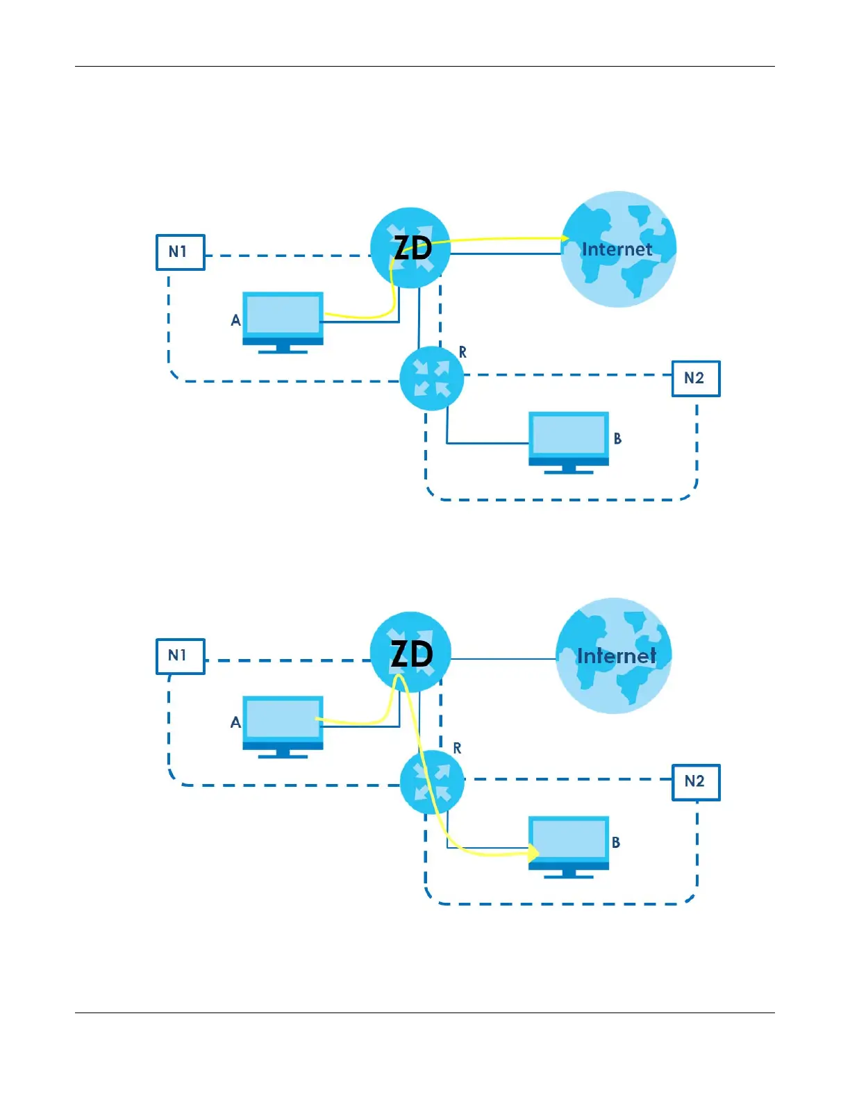 forwarding traffic to N2. In this case, the Zyxel Device routes traffic from A to R and then R routes the
