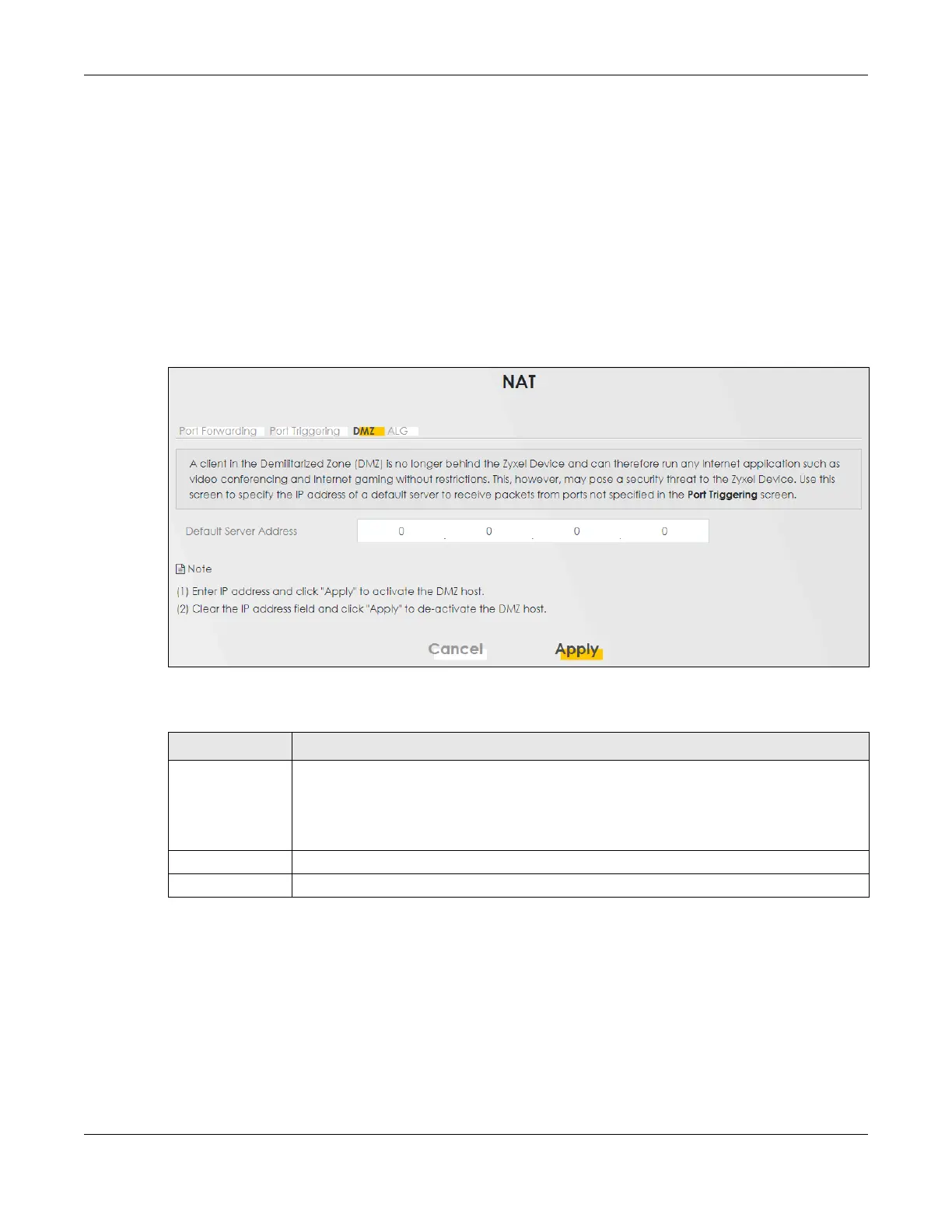 Apply to activate the DMZ host. Otherwise, clear the IP address in the Default Server