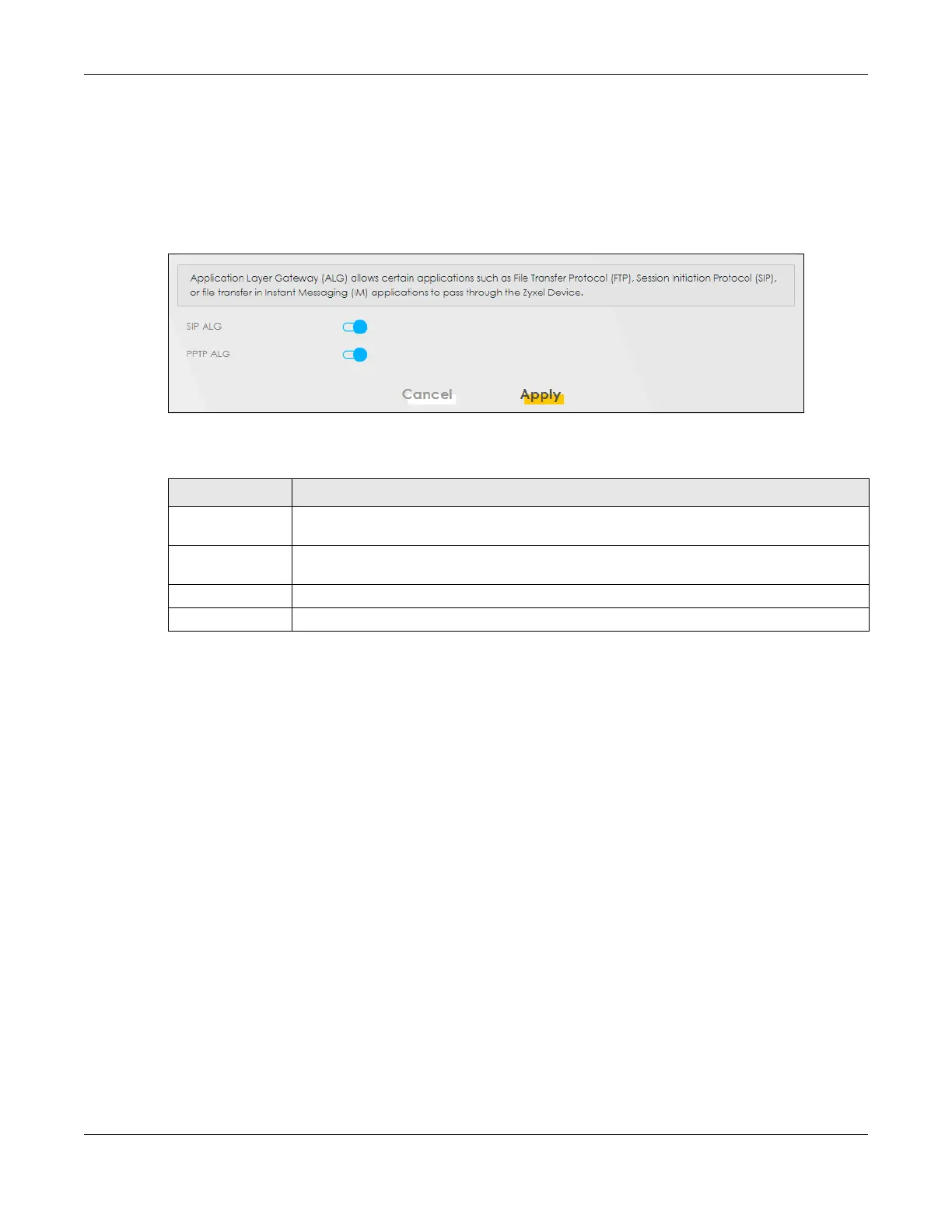 Initiation Protocol (SIP), or file transfer in Instant Messaging (IM) applications to pass through the Zyxel
