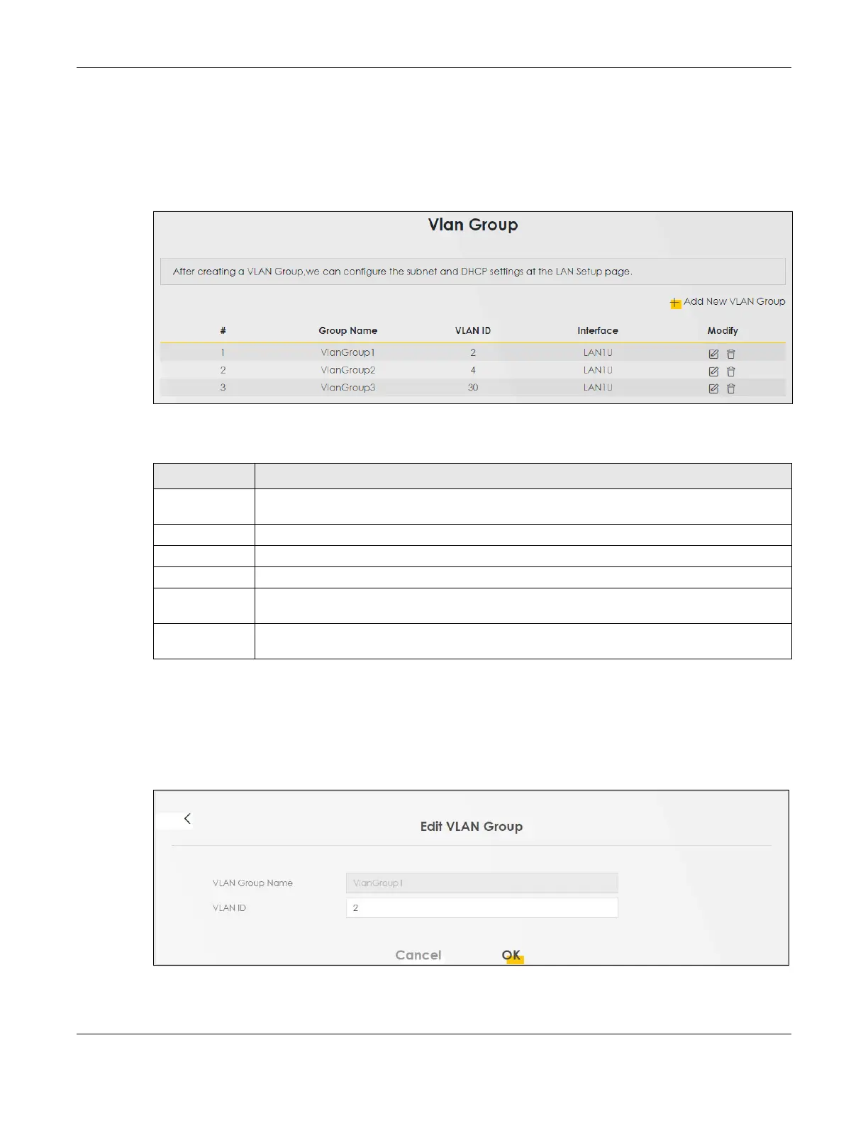 Modify Click the Edit icon to change an existing VLAN group setting or click the Delete icon to remove