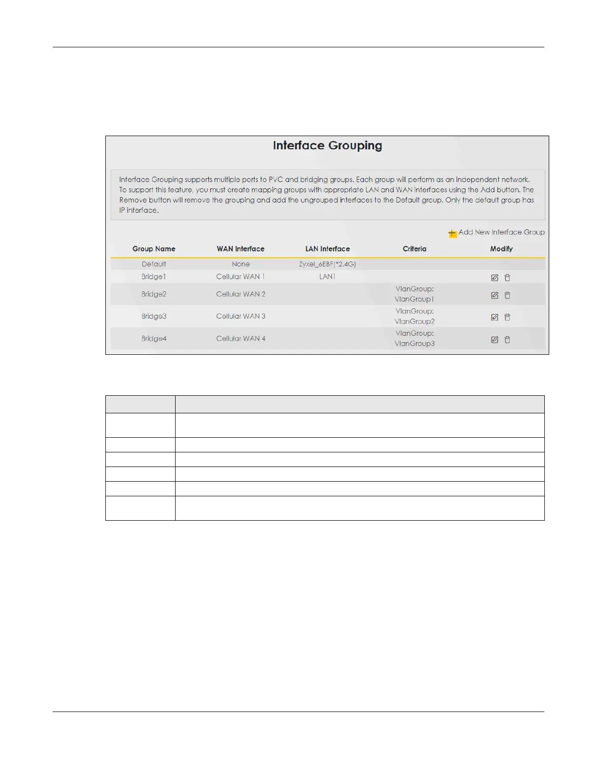 Modify Click the Edit icon to modify an existing Interface group setting or click the Delete icon to