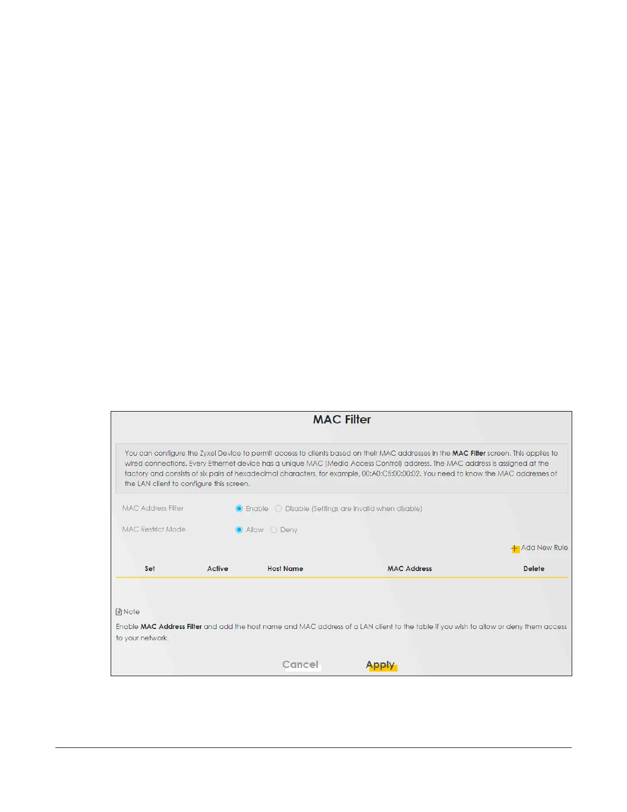 MAC Filter screen. This applies to wired connections. Every Ethernet device has a unique MAC (Media