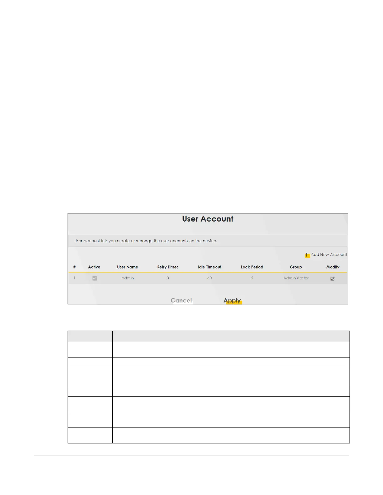 In the User Account screen, you can view the settings of the “admin” that you use to log into the Zyxel