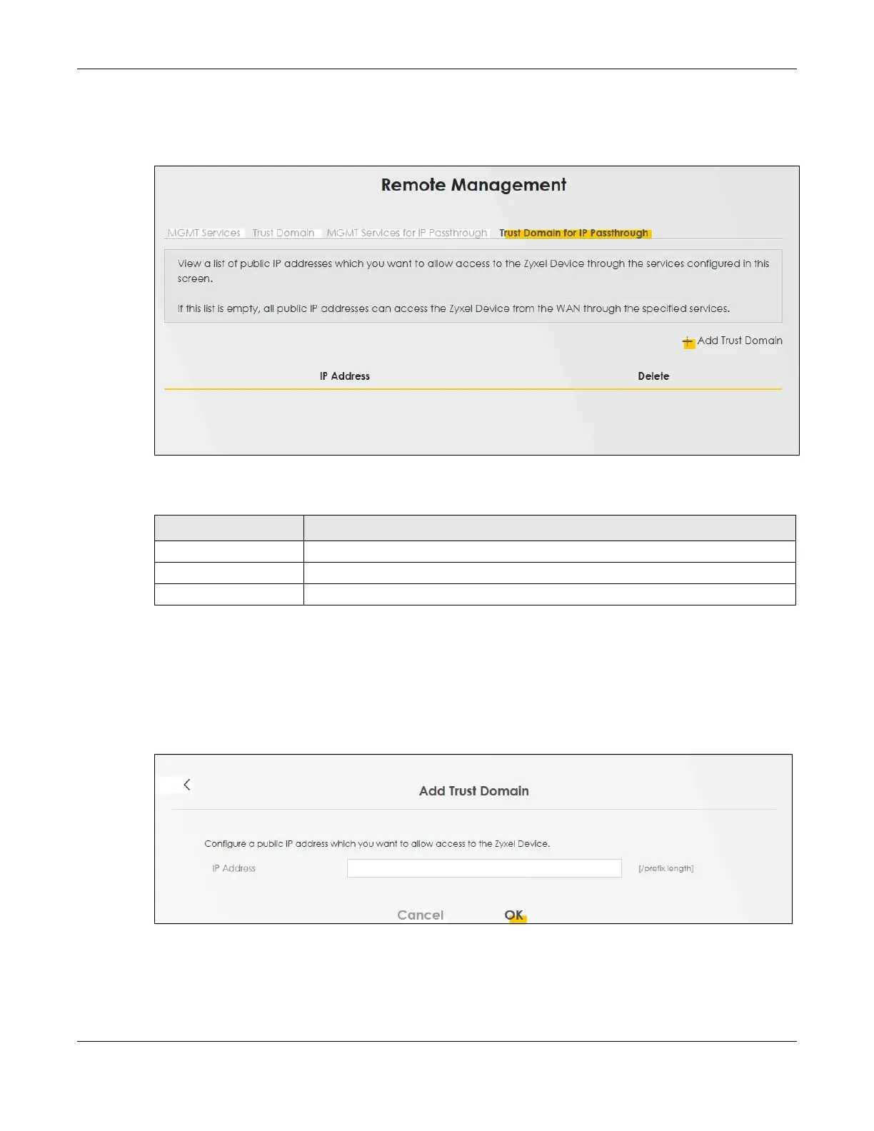 Table 100 Maintenance > Remote Management > Trust Domain for IP Passthrough