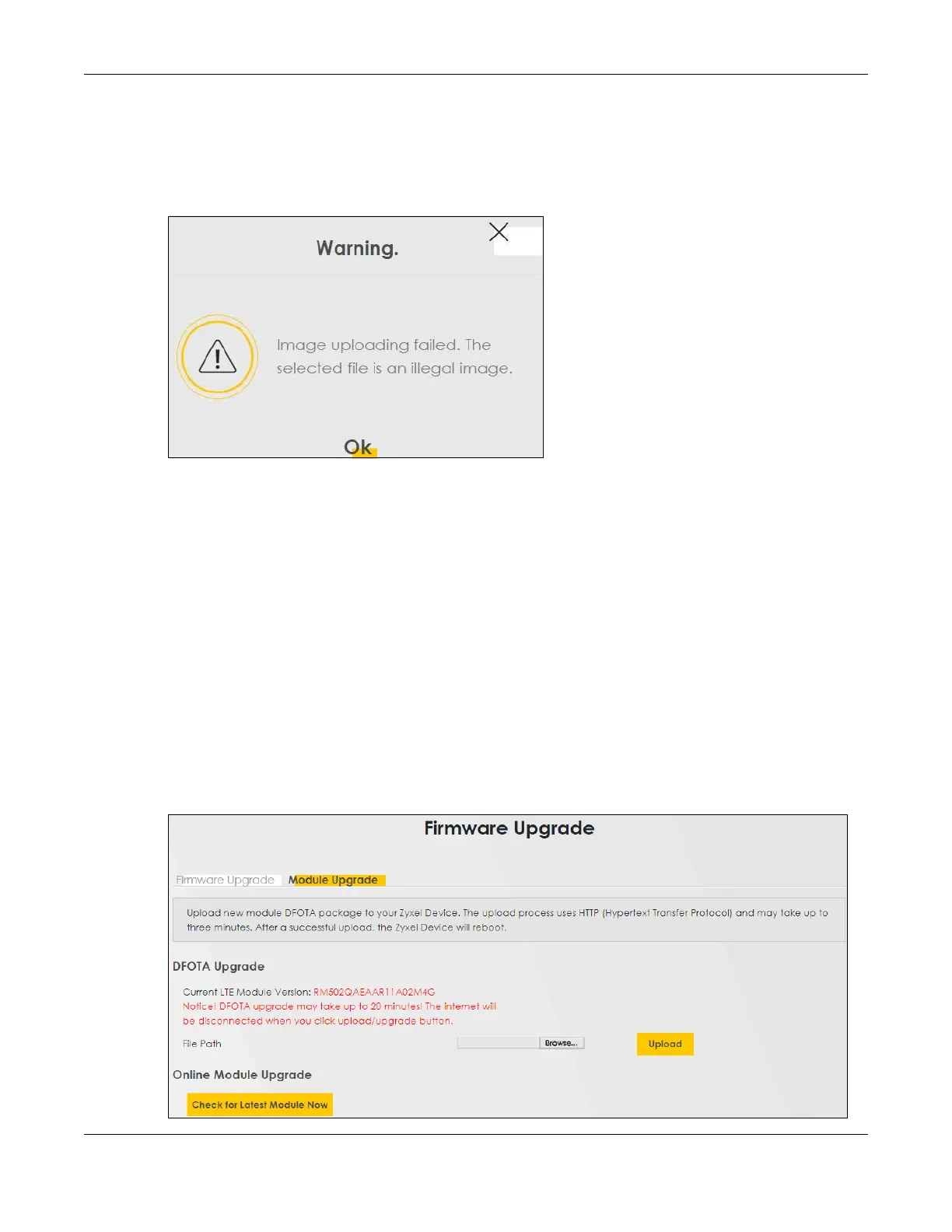 Do NOT turn off the Zyxel Device while module firmware upload is in