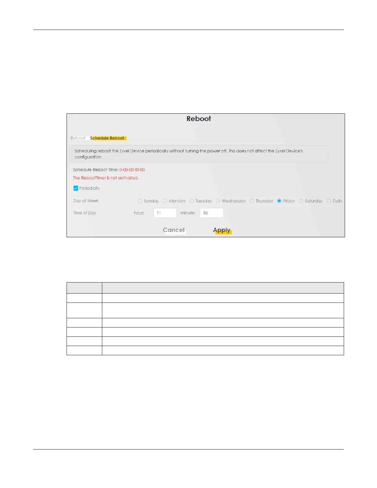 Periodicity Select this to have the Zyxel Device to reboot periodically.