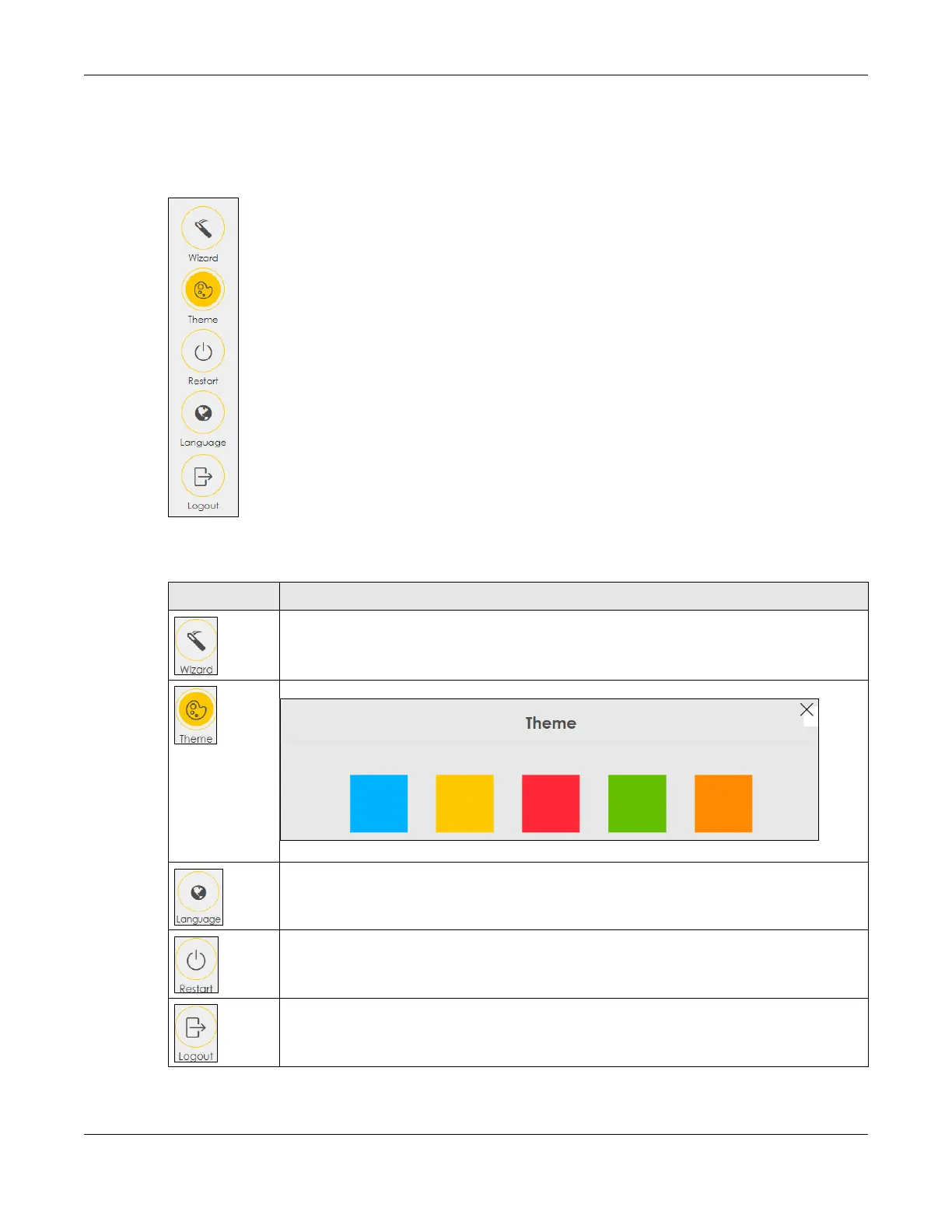 Theme: Click this icon to select a color that you prefer and apply it to the Web Configurator.