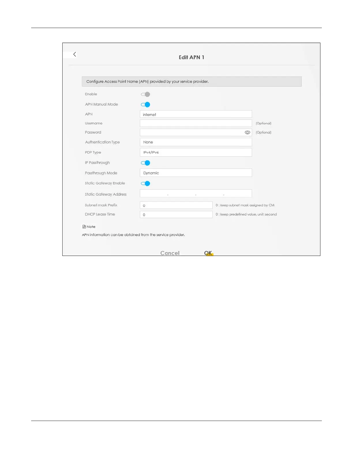 • IP Passthrough: Enable this to turn off the routing functionality on the Zyxel Device.