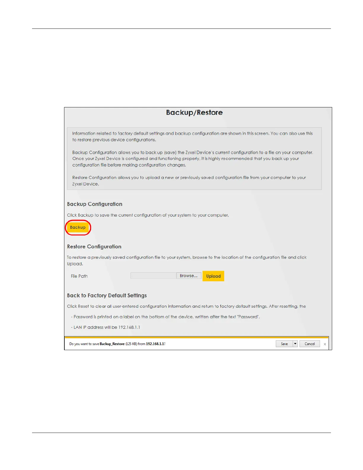 2 Under Backup Configuration, click Backup. A configuration file is saved to your computer. In this case,