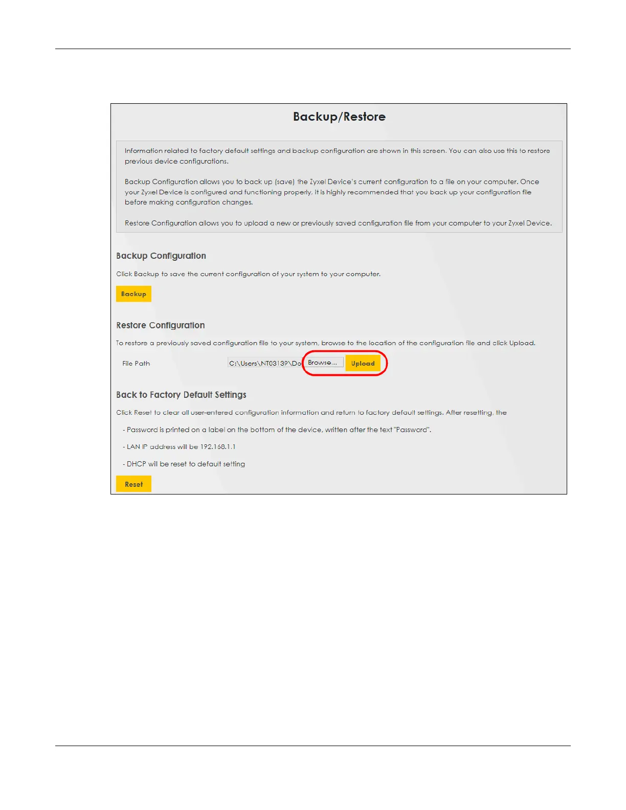 3 The Zyxel Device automatically restarts after the configuration file is successfully uploaded. Wait for one