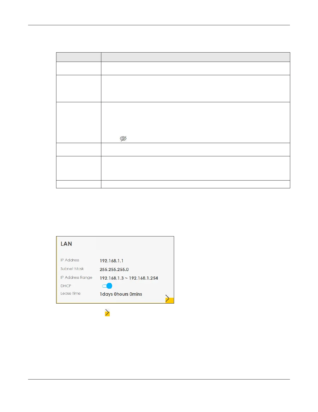 Click the Arrow icon ( ) to configure the LAN IP settings and DHCP setting for your Zyxel Device.