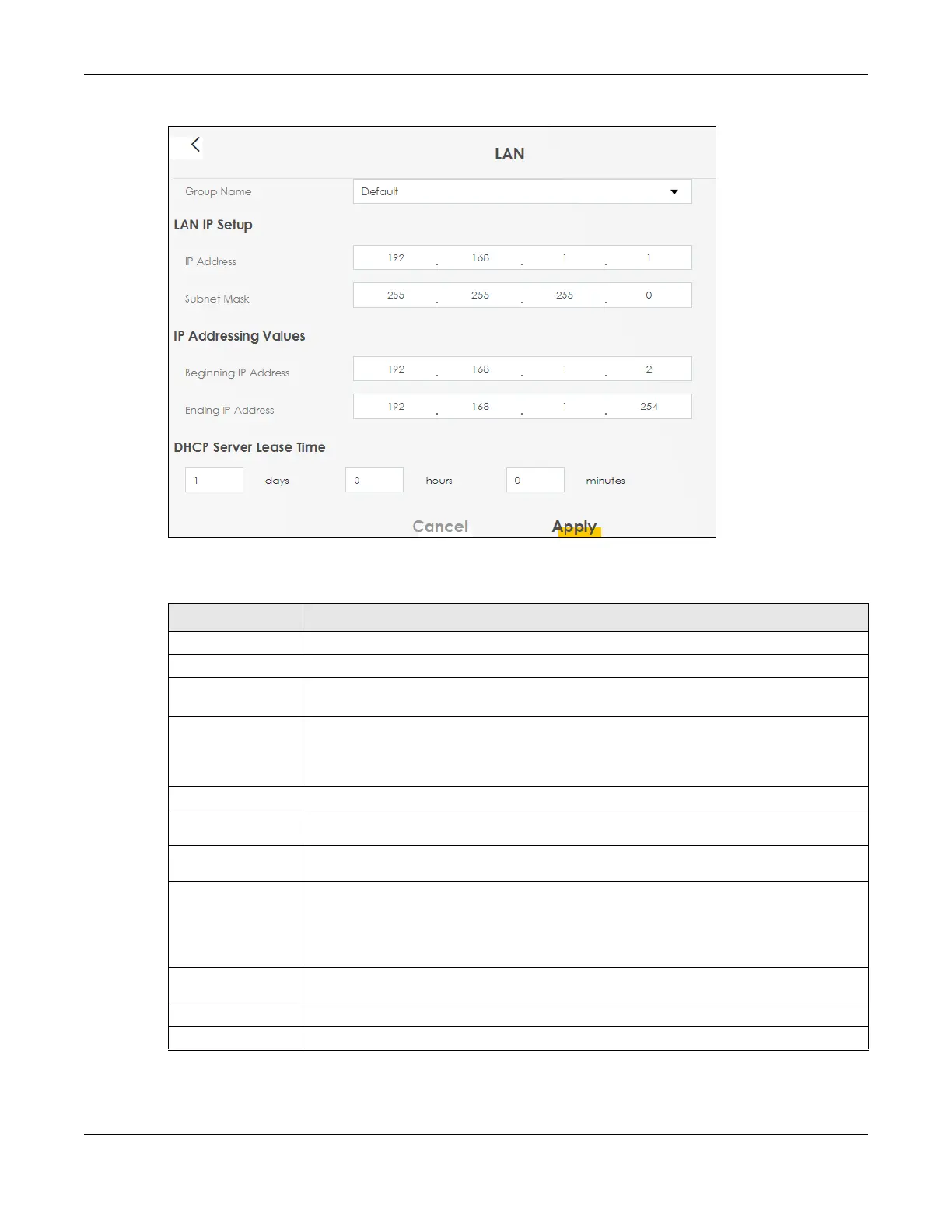 Table 14 LAN Setup