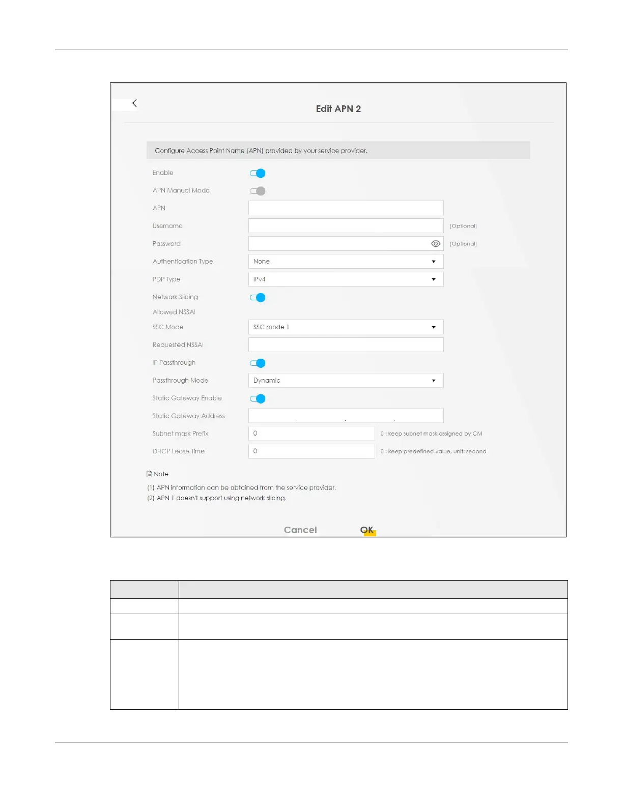 Enable Slide this to the right to enable the cellular connection of this APN on the Zyxel Device.