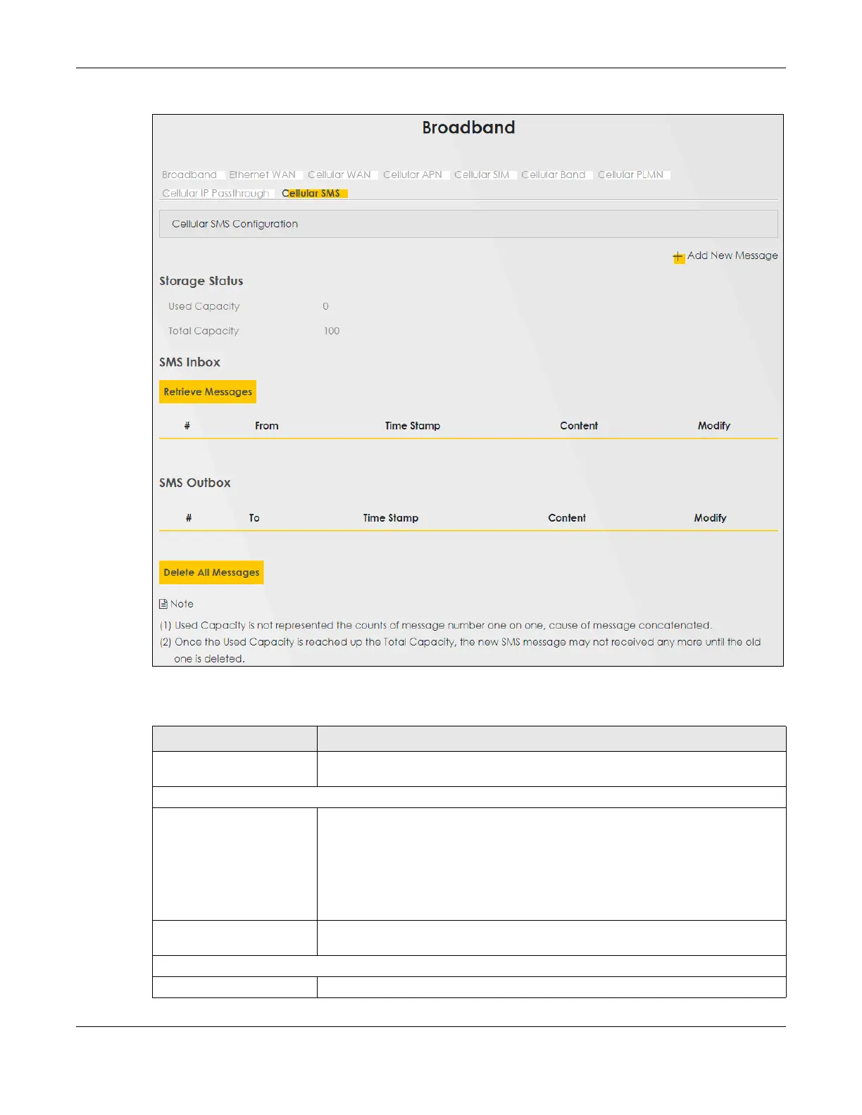 Total Capacity This displays 100. This is the maximum capacity to receive SMS messages on the Zyxel