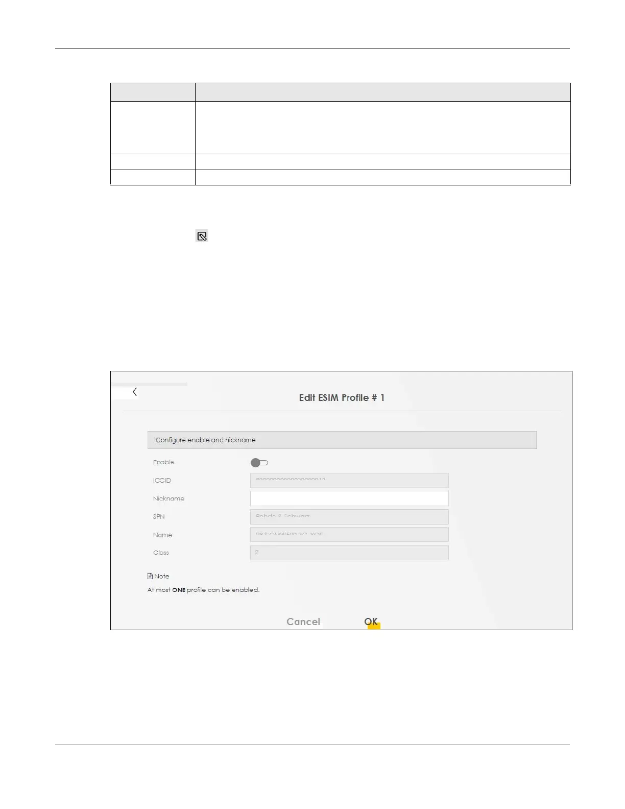 Modify Click the modify icon to go to the Edit ESIM Profile # n screen. See Section 7.12.1 on page 99