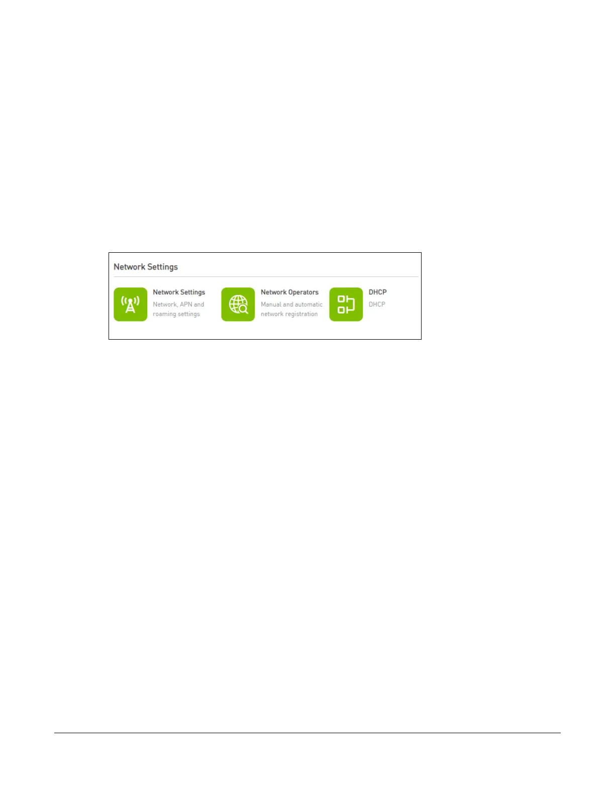 Use the Network Settings screens to configure the NR2301’s network, APN, roaming, and DHCP settings.