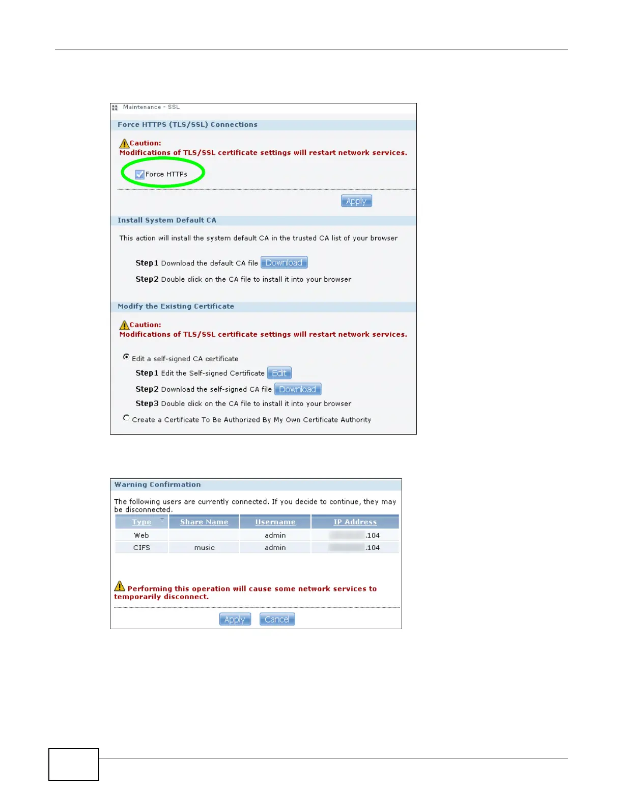 2 A warning screen pops up if applying your change may disconnect some users. Click Apply to
