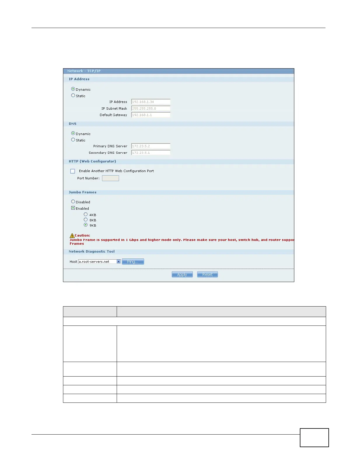 Table 33 Network > TCP/IP