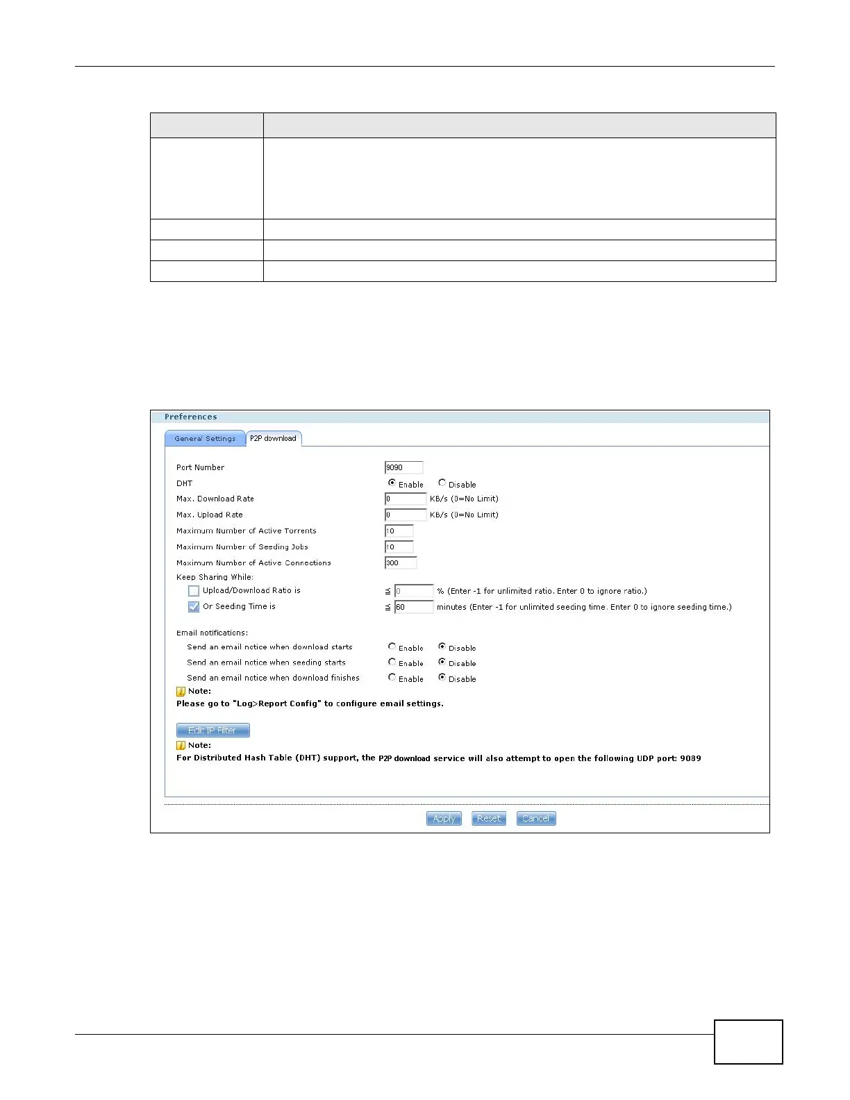 Click Applications > Download Service > Preferences > P2P download to open the following
