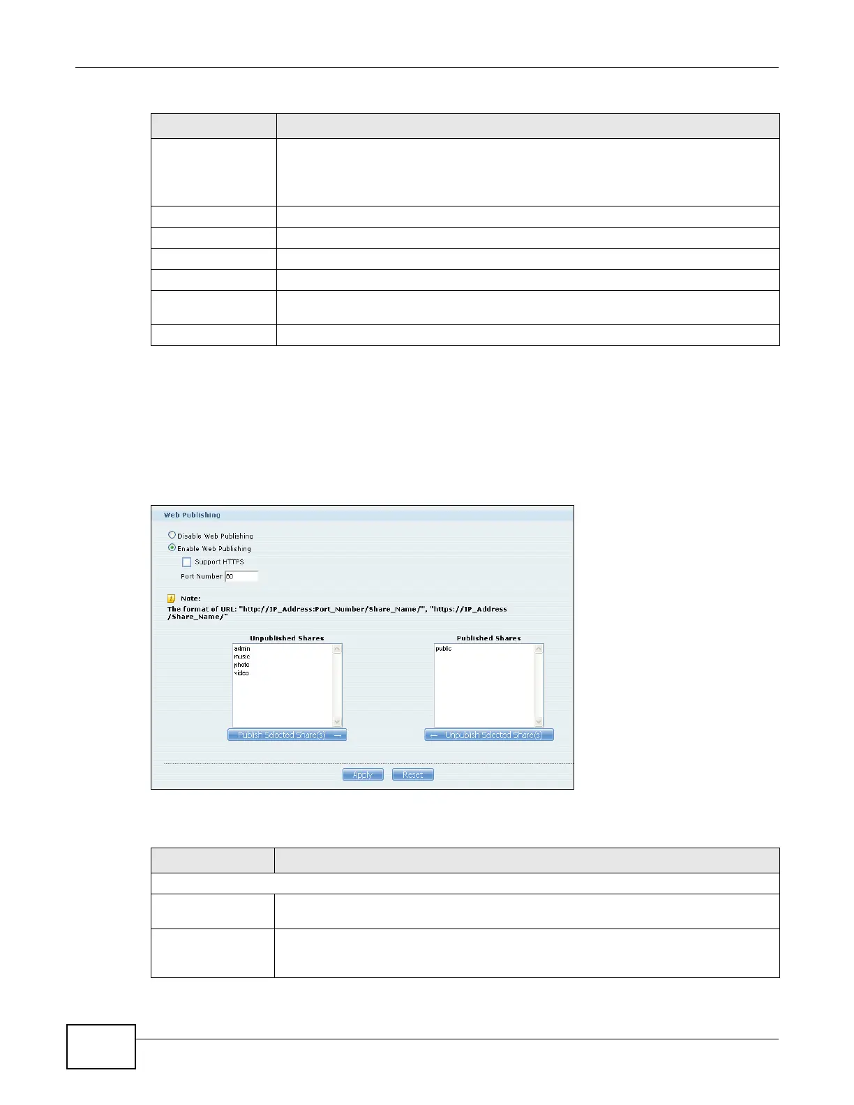 Use this screen to turn web publishing on or off and select shares to publish. Click Applications >