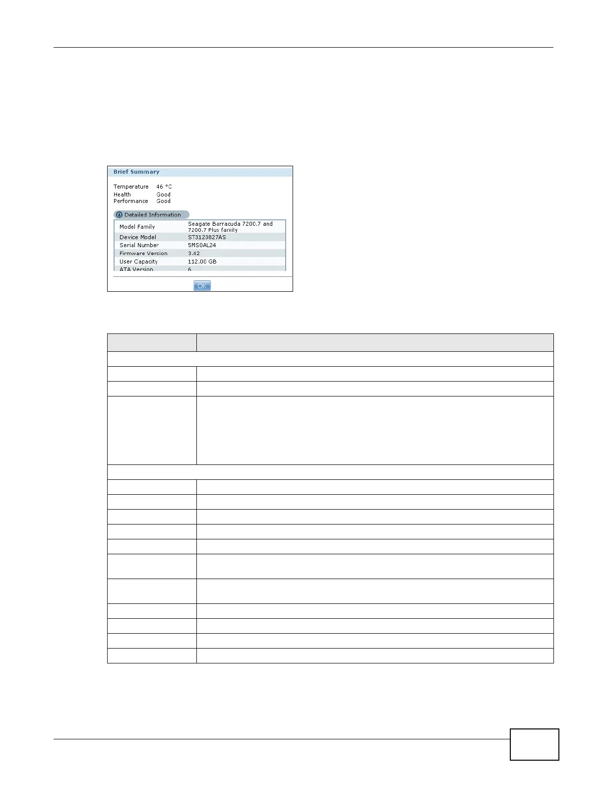Click Brief Summary in the Storage > S.M.A.R.T screen to display the following.
