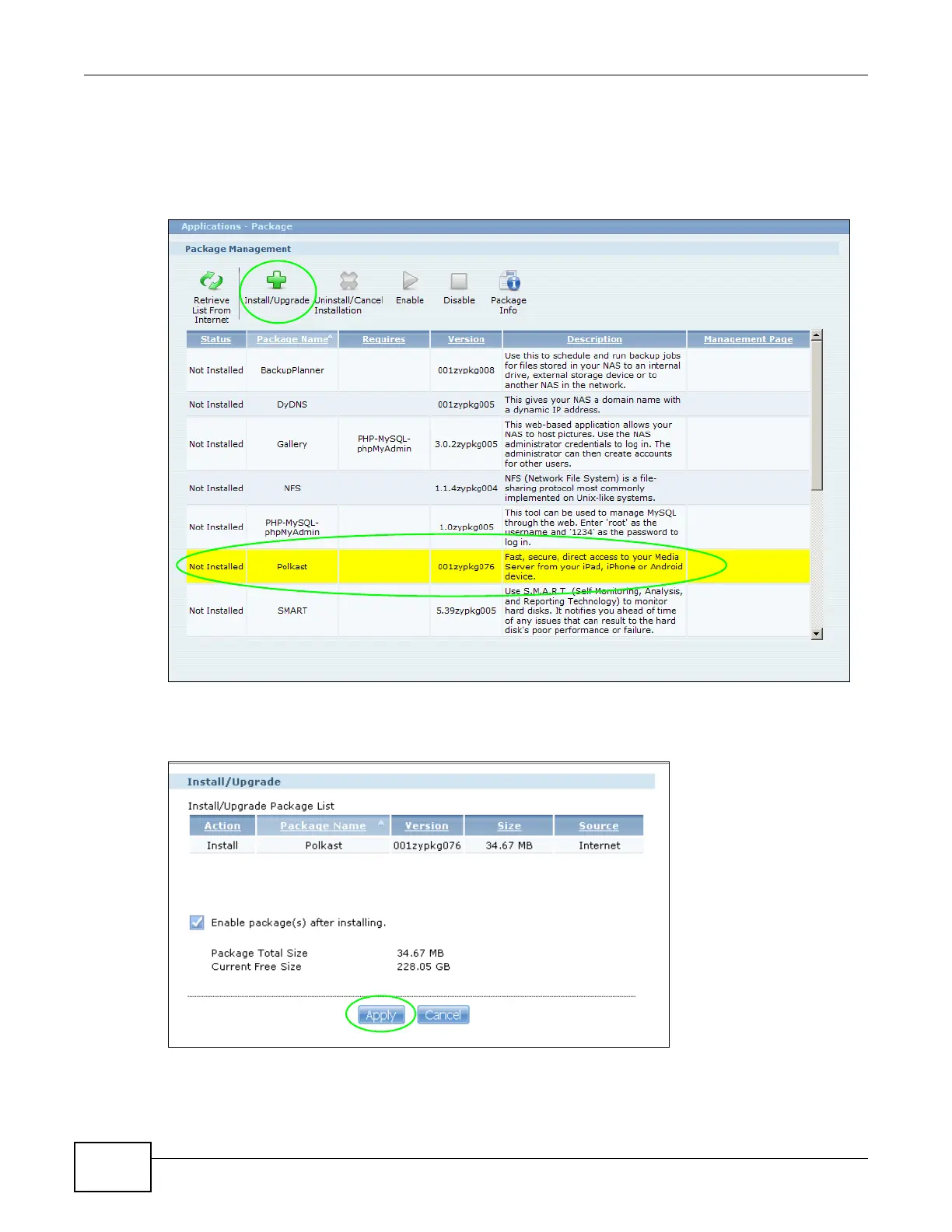 1 Click Applications > Package and select Polkast. Then select the Install/Upgrade icon.