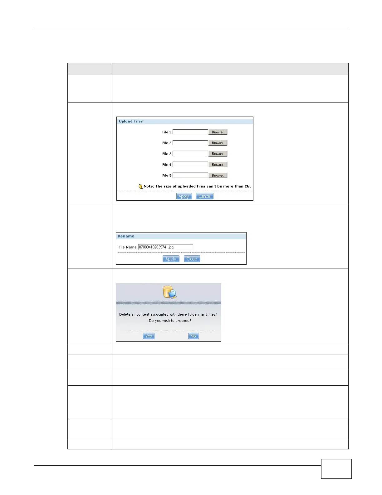 Delete Select a file/folder from the list and click this to open a warning screen. Click Yes to delete